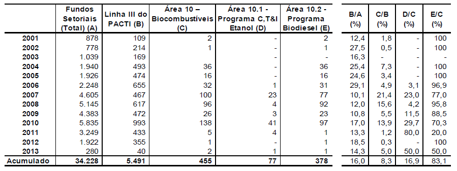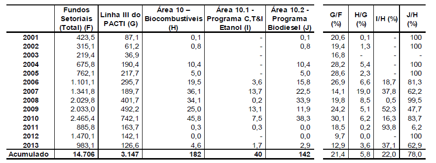 4. Entre 2006 e 2013 o programa de etanol recebeu R$ 40 milhões, valor muito inferior aos R$ 142 milhões recebidos pelo programa do biodiesel e aos R$ 3,1 bilhões geridos pela terceira linha do PACTI. Entre 2001 e 2013 os projetos referentes aos biocombustíveis responderam por somente 5,7% do total contratado no âmbito da terceira linha do PACTI, cujo valor foi repartido entre os programas de Etanol e de Biodiesel na proporção de 22% e 78% respectivamente, o que demonstra que o primeiro acabou sendo menos privilegiado ao longo de todo período frente às diretrizes que priorizaram o biodiesel.