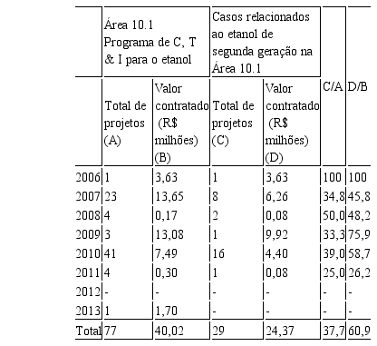 1. Entre 2001 e 2013, dos 455 projetos no programa de biocombustíveis, somente 77 deles se referiram ao etanol (16,9% do total). O restante foi direcionado para a área 10.2 referente ao biodiesel (Tabela 2).