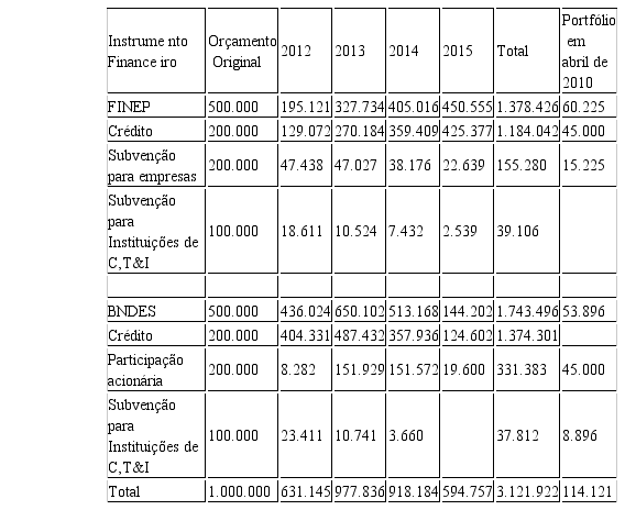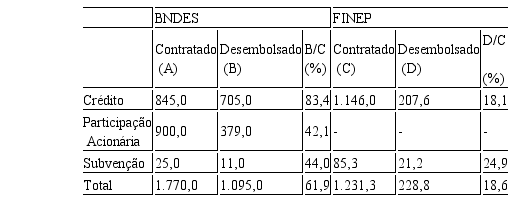 A Tabela 5 mostra que a categoria crédito (reembolsável) respondeu pela maior parcela dos repasses da FINEP e BNDES, e que somente a FINEP repassou recursos não reembolsáveis para empresas (totalizando R$ 155.280 mil) e que o BNDEs repassou R$ 331.383 mil no format de participação acionária. Por fim, verifica-se um salto importante em relação aos valores repassados ao segment sucroalcooleiro quando comparados com a posição do portfolio do BNDES e da FINEP em abril de 2010.