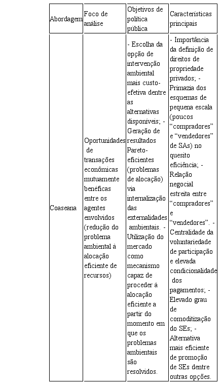 A teoria de base dos esquemas de PSA é, tradicionalmente, proveniente da Economia Ambiental Neoclássica - baseada no Teorema de Coase (daí a expressão abordagem coaseana), o que contribuiu para que sua conceituação fosse feita com preocupação central na obtenção de eficiência econômica por meio da internalização de externalidades positivas via pagamentos monetários, dando valor econômico aos fluxos de SEs. A lógica, portanto, é promover comportamentos em prol de sua conservação. (WUNDER, 2005; PAGIOLA; PLATAIS, 2007; ENGEL; PAGIOLA; WUNDER, 2008; FERRARO, 2008).