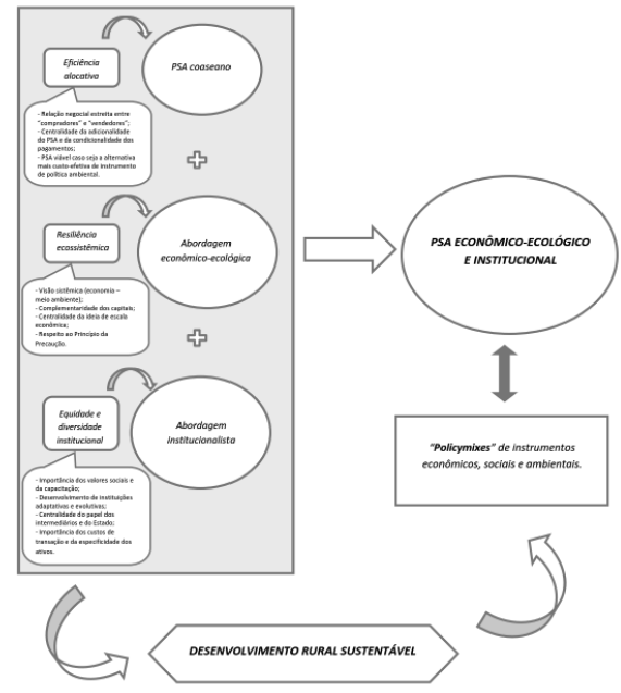 Além disso, essa visão de PSA privilegia a interpretação de que este instrumento faz parte de um arranjo dinâmico de políticas econômicas, sociais e ambientais (policymix). Tais arranjos, por sua vez, podem apresentar coevolução, uma vez que os objetivos, metas e meios para o alcance do desenvolvimento rural sustentável devem ser socialmente acordados.