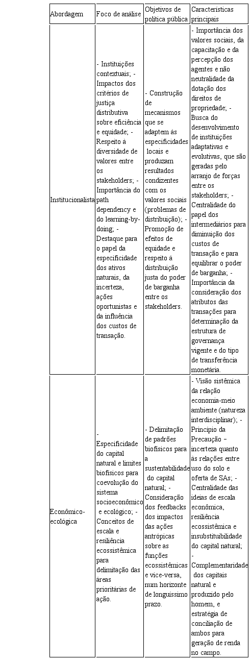 As críticas institucionalistas e as contribuições da EE mostram complementaridades em várias questões. Exemplos estão na ênfase dos efeitos de PSA sobre a equidade, as interdependências que surgem, dadas as características de bem público dos SEs, as incertezas derivadas da escassa compreensão sobre as relações entre os diferentes usos de terra e a oferta de serviços (derivando, daí, a necessidade de uma abordagem precaucional), a importância de considerar os diferentes contextos sociais e ecológicos para adequação de um mecanismo, etc.
