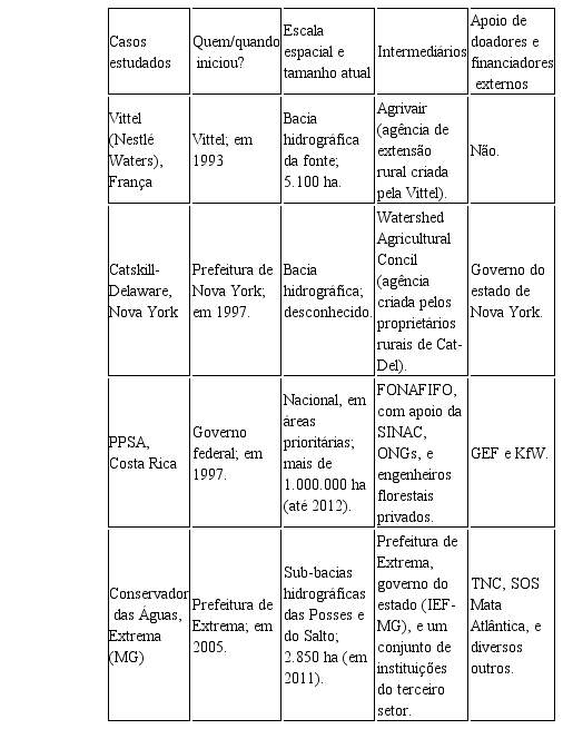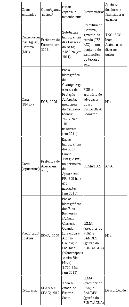 Todos os casos aqui analisados são recentes, instituídos já na segunda metade da década de 2000. O Projeto Conservador das Águas, de Extrema-MG, é a experiência mais conhecida em âmbito nacional, sendo de iniciativa do poder público municipal e englobando amplo espectro de stakeholders. Pode-se dizer que é o mecanismo mais maduro e estudado dentre os demais analisados em âmbito nacional, sendo, pois, utilizado como benchmark pelas outras experiências.