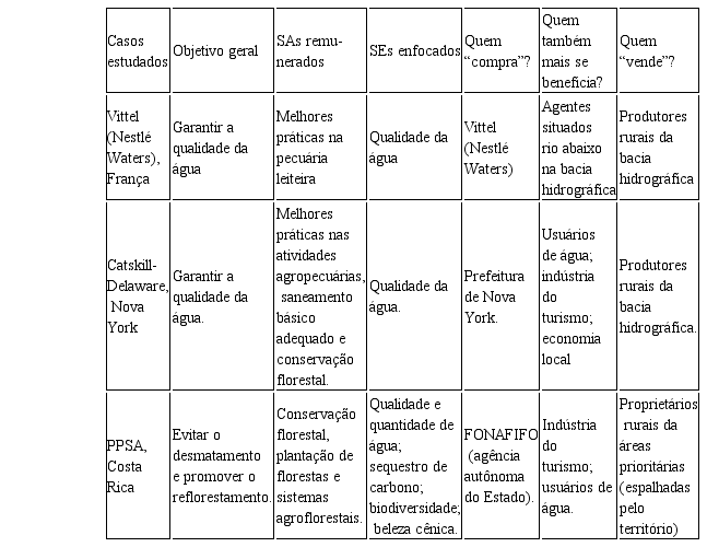 Em relação às experiências internacionais, foram analisados dois casos de experiências de PSA que, a posteriori, percebeu-se que se adéquam bastante ao conceito coaseano, quais sejam: o caso da marca de água mineral Vittel, na França, e do sistema da bacia hidrográfica de Catskill-Delaware, no estado de Nova York (EUA). Em ambos os casos, os serviços hidrológicos de purificação da água ofertados pelos ecossistemas locais são essenciais para a oferta de água de alta qualidade para consumo humano, sendo determinantes para a viabilidade dos negócios em questão. De acordo com esta constatação, foram desenvolvidos incentivos econômicos na forma de PSA aos produtores rurais das bacias hidrográficas de influência das regiões mencionadas.