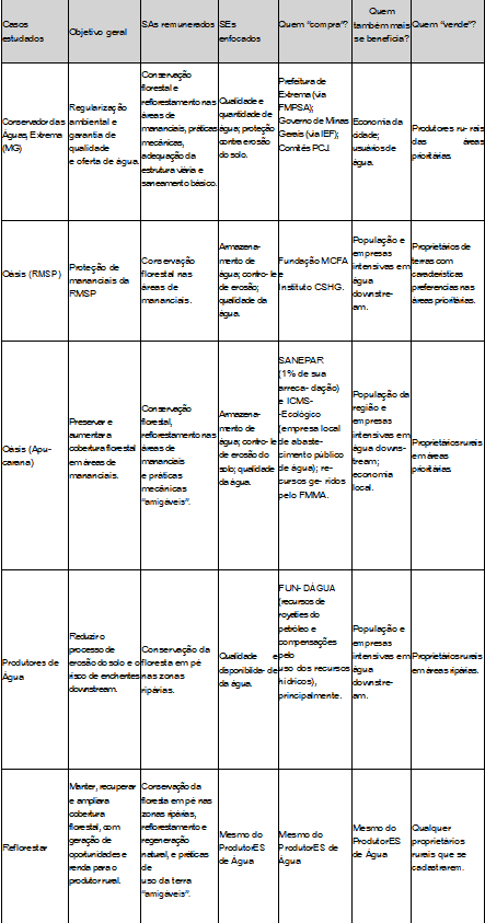 No que se refere às iniciativas nacionais de aplicação do instrumento foram analisados, de iniciativa pública, o Projeto Conservador das Águas de Extrema-MG, que está inserido dentro do Programa Produtor de Águas, da Agência Nacional de Águas (ANA), e de iniciativa privada, o Programa Oásis, em São Paulo-SP e Apucarana-PR. Partindo para análise de políticas ambientais estaduais, analisou-se o programa ProdutorES de Águas, que posteriormente se transformou no Programa Reflorestar (ES), iniciativa inovadora em termos de política estadual, e que tem demonstrado avanços no sentido de ter uma abordagem integrada, com objetivos ambientais, sociais e econômicos. Os Apêndices C e D sintetizam as principais características de cada uma dessas experiências. (Apêndices C e D).