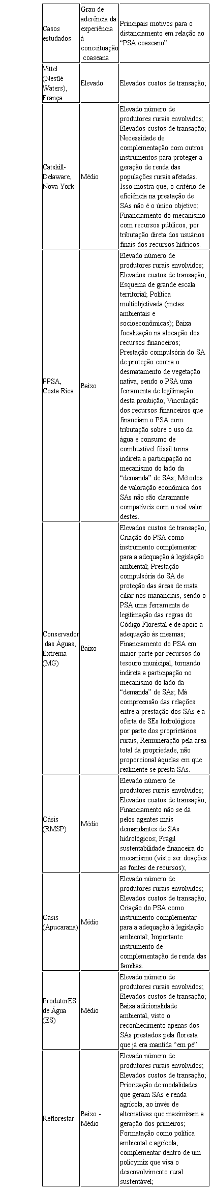 O distanciamento entre teoria e prática conforme descrito na literatura revista na seção anterior (Quadro 1) ficou mais evidente ao se analisar o programa do governo costarriquenho Pagos por Servicios Ambientales (PPSA), considerado como o pioneiro e mais bem-sucedido caso de PSA em nível nacional. Entre outras coisas, o alargamento da escala de atuação do programa, a intermediação realizada pelo governo e a existência de vários objetivos que além da eficiência alocativa são atributos próprios da dinâmica do mecanismo de PSA da Costa Rica que não permitem que o mesmo seja caracterizado como um caso puro de PSA coaseano. Os Apêndices A e B trazem as principais características dos casos internacionais analisados5. (Apêndice A e B).