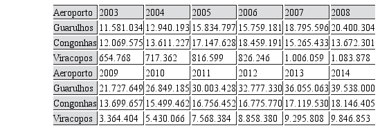 Em 2003, a demanda por passageiros em Viracopos era de 655 mil. Com as operações da Azul, essa demanda chegou a 9.846.853 em 2014. Congonhas manteve-se próximo de sua capacidade operacional máxima ao passar de 12.069.575, em 2003, para 18.146. 405 em 2014, depois de uma redução para cerca de 13,6 milhões devido à restrição dos slots, como mencionado. Entre 2003 e 2014, o Aeroporto de Guarulhos passou de 11.581.034 para 39.538.000 passageiros, mantendo-se em primeiro lugar no país, especialmente porque é o que mais oferece rotas aéreas internacionais regulares (Tabela 1).
