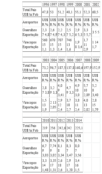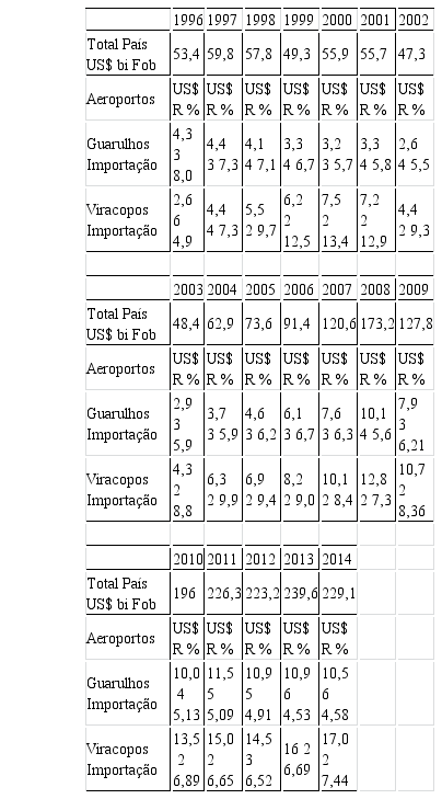 O destaque na movimentação de mercadorias ficou para os aeroportos de Guarulhos e Viracopos, ambos localizados no Estado de São Paulo. O primeiro porque dispõe de maior número de rotas aéreas internacionais, e Viracopos porque se constituiu como centro cargueiro para empresas aéreas internacionais. Porém, entre 1996 e 2014, o desempenho histórico entre esses dois aeroportos aponta para melhor evolução de Viracopos nas importações, enquanto que, em igual período, nas exportações de mercadorias, ambos tiveram perdas relativas devido à crise internacional de 2008, com pequena recuperação para Viracopos.