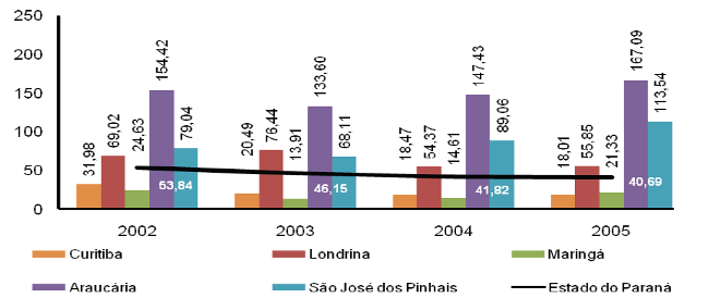Novamente com a série de tempo, o GPAPC médio no Paraná atingiu o valor de R$ 66,33, medida superada por cinco dos dez municípios. Araucária apresentou um GPAPC um montante próximo dos R$ 163,67, quociente superior em 146,7% ao do estado, São José dos Pinhais R$ 149,82 e em Cascavel R$ 114,31. Nos municípios de Curitiba e Londrina, os quocientes ficaram pouco acima do estado,com R$ 69,76 e R$ 66,92, respectivamente. Com montantes abaixodo GPAPC médio, Paraná, Maringá, Paranaguá, Ponta Grossa, Guarapuavae Foz do Iguaçu atingiram R$ 37,82, R$ 24,50, R$ 23,39, R$21,50 e R$ 18,48, nessa ordem.