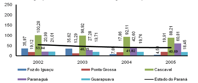 Na análise do GPAPC médio, tendo como base os R$ 45,62 destinados pelo estado, apenas o município de Cascavel retratou valores acima desse teto, cerca de R$ 94,88, com máximo de R$100,28 no ano de 2002. Nos outros quatro municípios, os montantes ficaram abaixo. Em Paranaguá o GPAPC médio atingiu R$ 37,92, com mínimo de R$ 20,99 em 2002, em Foz do Iguaçu alcançou R$ 100,28 no ano de 2002. Nos outros quatro municípios, os montantes ficaram abaixo. Em Paranaguá o GPAPC médio atingiu R$ 37,92,com mínimo de R$ 20,99 em 2002, em Foz do Iguaçu alcançou R$20,98, com um pequeno valor de R$ 4,50 em 2005, em Guarapuava chegou aos R$ 19,73, com mínimo de R$ 18,45 em 2005, e em Ponta Grossa completou R$ 17,55, com mínimo de R$ 13,29 em 2003 (Gráfico 2).