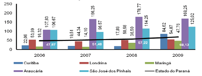 O GPAPC médio do estado passou para R$ 56,17, com o melhor produto anotado no ano de 2009, de R$ 69,13. Dois municípios apresentaram resultados melhores que o do Paraná. Repetidamente o município de Araucária exibiu um desembolso próximo dos R$ 155,27, com máximo de R$ 178,77 em 2009, seguido por São José dos Pinhais com R$ 110,63, com maior valor em 2009 de R$ 125,02. Com quocientes abaixo dos apurados para o estado, Londrina apresentou um GPAPC médio de R$ 50,94, com mínimo de R$ 44,34 no ano de 2007, seguidos por Curitiba com R$ 36,04, com menor valor de R$ 17,89 em 2008, e Maringá com R$ 28,67, com mínimo de R$ 14,10 em 2007 (Gráfico 3).