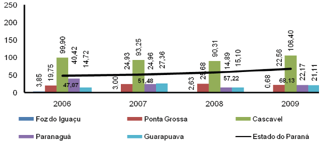 Na análise do GPAPC médio, o valor de R$ 56,17 observado para o Paraná, representou um limite superado somente pelo município de Cascavel, cuja soma atingiu R$ 97,47, com máximo de R$106,40 no ano de 2009. Nos outros quatro municípios as medidas indicaram Paranaguá com R$ 25,61, com menor destinação de R$ 14,89 em 2008, Ponta Grossa com R$ 23,23, com mínimo de R$ 22,56 em 2009, Guarapuava com R$ 19,57, com menor valor de R$ 14,72 em 2006, e Foz do Iguaçu com inexpressivos R$ 2,54, com mínimo de R$ 0,68 em 2009 (Gráfico 4).