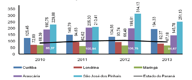 Nas ponderações sobre o GPAPC médio do estado, o quociente atingiu R$ 97,18, com máximo absoluto de R$ 100,94 no ano de 2011, o maior valor em todos os períodos analisados. Três municípios exibiram desembolsos melhores: São José dos Pinhais destinou R$ 251,39, com ápice de R$ 314,13 em 2012, Araucária alocou R$ 185,41, com máximo de R$ 205,30 em 2011, e Curitiba reservou R$ 151,03, com topo de R$ 194,33 no ano de 2013. Com aplicaçõesabaixo do estado, o GPAPC médio de Londrina atingiu R$ 85,91, commínimo de R$ 72,89 em 2010, e de Maringá totalizou R$ 66,17, commenor soma em 2011 de R$ 62,62 (Gráfico 5).