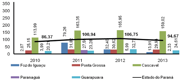Nas totalizações do GPAPC médio, somente Cascavel ficou acima dos R$ 97,18 do Paraná, destinando R$ 150,58, com máximo em 2012 de R$ 165,95. Na sequência, Foz do Iguaçu apresentou um GPAPC médio de R$ 31,91, com um pequeno montante de R$ 2,07 em 2010, Ponta Grossa de R$ 29,38, com um mínimo de R$ 25,15 em 2010, Guarapuava de R$ 25,21, com menor valor de R$ 20,21 em 2010, e Paranaguá de R$ 9,96, com um diminuto quociente de R$ 2,30 (Gráfico 6).