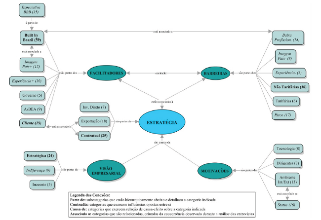 Na categoria Estratégia, a estratégia Contratual possui maior destaque, assim como a Exportação também é considerada relevante. O Investimento Direto, apesar de ter sido uma estratégia adotada por dois escritórios entrevistados, é considerado uma etapa com alto risco e comprometimento financeiro, motivos que incentivam a busca pelas alternativas supracitadas.
