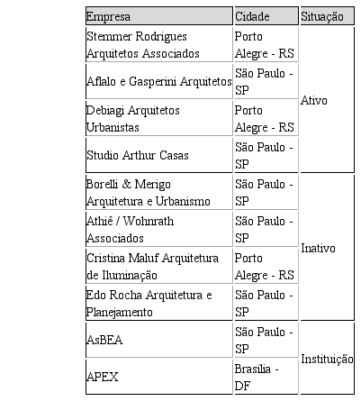 Após o desenvolvimento das três fases de seleção, o Quadro 1 resume a amostra de pesquisa, englobando os escritórios de arquitetura, as instituições e sua situação frente ao projeto.