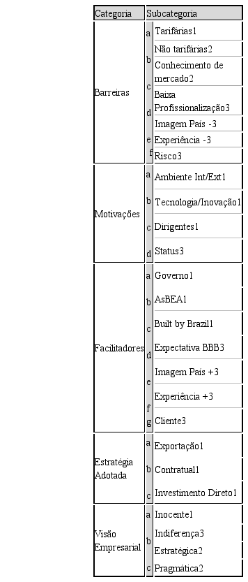 A categoria Motivações não apresentou uma subcategoria predominante. As subcategorias Tecnologia e Dirigentes se mostraram menos relevantes, enquanto a relação entre o Ambiente Interno e Externo foi considerada importante. Já a inserção do Status diferenciado no mercado interno pela internacionalização é a subcategoria mais relevante.