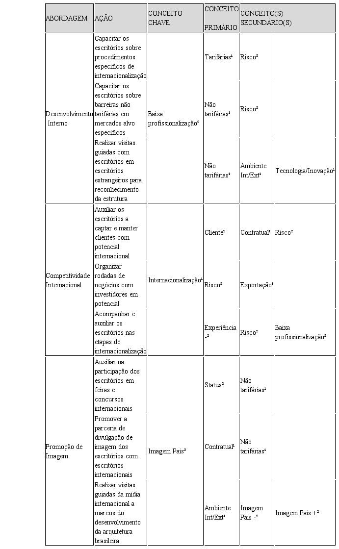 A interação entre os resultados da pesquisa e o objetivo do artigo é materializada em nove propostas de ações que são capazes de potencializar a eficácia do projeto. As ações são divididas em três tipos: voltadas para o desenvolvimento interno dos escritórios; voltadas para a competitividade internacional dos escritórios; e voltadas para a promoção da imagem da arquitetura brasileira no mundo.