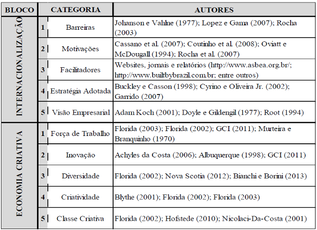 Para elaboração do roteiro de entrevistas e análise dos dados, foram levantadas cinco categorias. O objetivo das categorias de análise é nortear as entrevistas, embasar o roteiro e posteriormente guiar a categorização na análise de conteúdo. O Quadro 2 ilustra as cinco categorias e as principais obras utilizadas para sua criação.