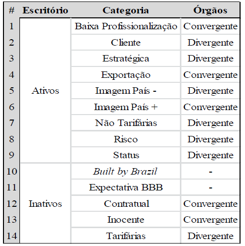 Em relação às subcategorias Built by Brazil e Expectativa dos escritórios em relação ao projeto (Expectativa BBB), os escritórios inativos não demonstraram interesse em detalhar o projeto, mostrando desconforto e evitando respostas ao serem questionados diretamente. Não é possível definir uma visão convergente ou divergente em relação aos órgãos, pois a subcategoria diz respeito ao projeto.