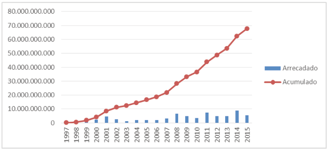 Há de se perceber que o montante da arrecadação anual apresenta variação significativa. Isto se deve principalmente, segundo se pode levantar nos relatórios de gestão da ANATEL que serviram como base para elaboração do Gráfico 1, a ocorrência de ciclos com maior arrecadação de recursos provenientes de outorga de serviços, notadamente nos anos de 2001, 2008, 2011 e 2014.