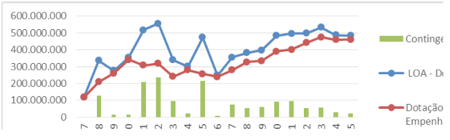 Porém, observando os dados da Tabela 3 e no Gráfico 2 percebe-se uma aproximação e possível correlação dos valores autorizados na LOA com os efetivamente liberados para empenho a partir do ano de 2006. Isto remete a uma avaliação mais minuciosa de suas possíveis causas.