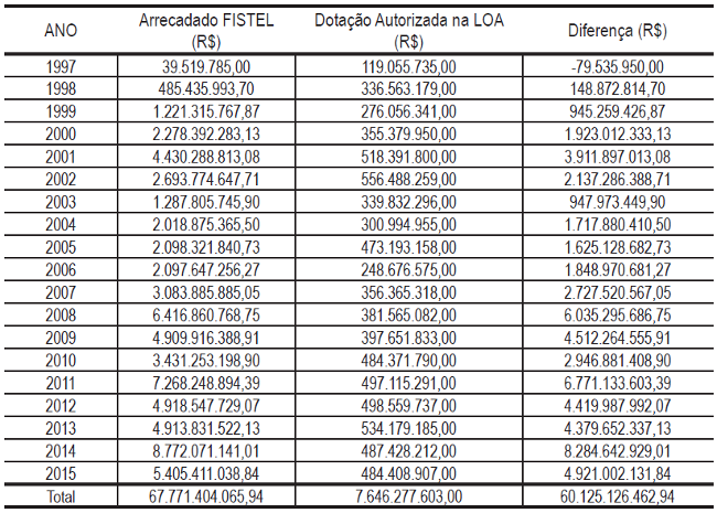 Acrescente-se a essa combinação, ainda, o descompasso entre o montante anualmente arrecadado com o fundo vinculado, o FISTEL, e a dotação orçamentária autorizada. Isto produz uma retirada de recursos com efeito asfixiante para o investimento no setor e perverso para o usuário do serviço, que em última instância paga o incremento de preço decorrente na prestação do serviço, sem a garantia de uma atuação efetiva do órgão regulador.