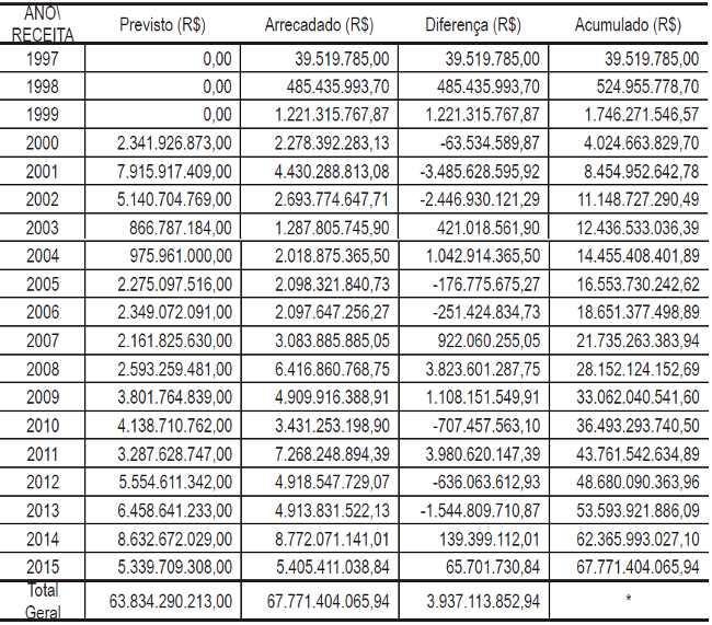 Os valores apresentados na Tabela 2 demonstram que, desde a sua criação em 1997, a ANATEL auferiu receitas próprias da ordem de R$ 67,77 bilhões, ante a uma estimativa de arrecadação de R$63,83 bilhões, o que resultou em uma diferença positiva da ordem de R$3,93 bilhões.