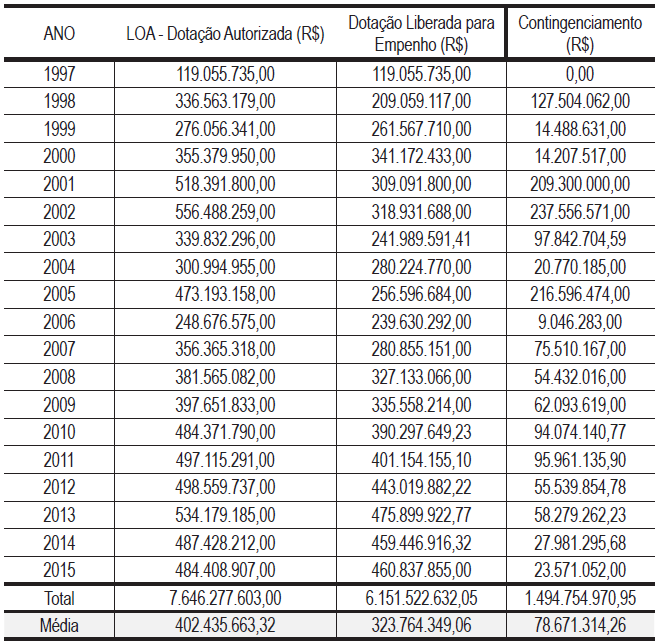 No período estudado, a ANATEL teve seu orçamento contingenciado na ordem de R$ 1,49 bilhão, sendo a média dos contingenciamentos anuais da ordem de R$ 78,6 milhões. Estes valores representam 19% da dotação autorizada na LOA para a ANATEL no período. Ressalva-se que a média não espelha os valores anuais, visto que, desconsiderando o ano atípico de 1997, os valores encontrados variaram de um percentual de 4% no ano 2000 até 46% em 2005. Tal fato contraria flagrantemente o disposto no art. 15 da LGT, que assegura que: “A fixação das dotações orçamentárias da Agência na Lei de Orçamento Anual e sua programação orçamentária e financeira de execução não sofrerão limites nos seus valores para movimentação e empenho.” (BRASIL, 1997b).