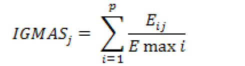 A agregação dos indicadores foi realizada conforme proposto por Sousa, Lima e Khan (2015) e resultou no Índice de Gestão Municipal de Assistência Social (IGMAS). Os indicadores foram quantificados por meio da atribuição de escores, e esta ocorreu da seguinte forma: foi atribuído escore 1(um) na existência do instrumento no município e 0 (zero).na ausência deste. O procedimento matemático para a agregação consistiu na aplicação da equação: