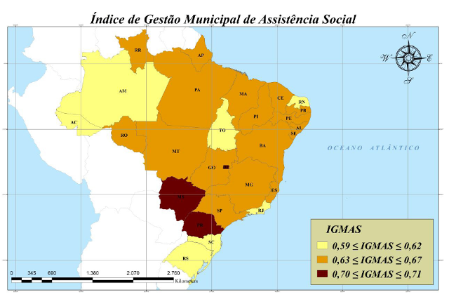 Por fim, para uma melhor visualização da distribuição espacial do IGMAS no território brasileiro, foi construído um mapa temático com o uso do software ArcGis. V10.