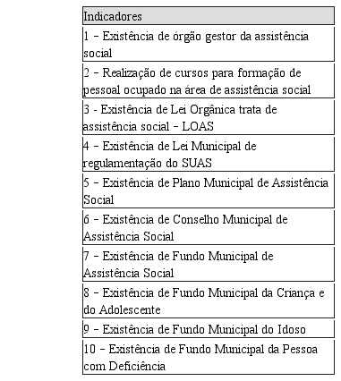 Acredita-se que a adoção dos instrumentos básicos de gestão da Assistência Social pode contribuir para a efetividade das políticas públicas nessa área, o que permite assumir uma relação de causalidade na qual maior nível de implementação de instrumentos de gestão possibilita melhores resultados no que diz respeito ao acesso da população aos serviços de assistência social. Nessa perspectiva, buscou-se mensurar o nível de implementação de instrumentos de gestão municipal da assistência social a partir da agregação de um conjunto de 10 indicadores selecionados do banco de dados da pesquisa, conforme exposto no Quadro 1: