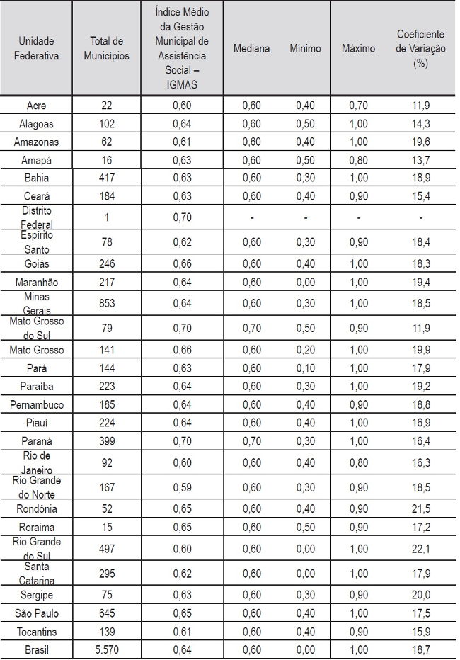 De um modo geral, o nível de implementação de instrumentos de gestão municipal de assistência social é baixo, alcançando um percentual médio de 64% dos instrumentos avaliados. A análise do coeficiente de variação mostrou que não existe heterogeneidade significativa entre as unidades federativas. Contudo, foi possível identificar similaridades entre algumas delas. Os municípios dos estados do Mato Grosso do Sul, Paraná e o Distrito Federal lideraram na implementação dos mecanismos de gestão municipal de assistência social. No entanto, há ainda estados que apresentam certa fragilidade no aparato institucional para realizar uma boa gestão da área social, sendo o Rio Grande do Norte o caso com o menor nível de implementação.
