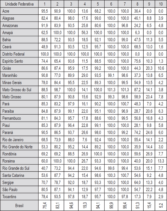 Ollaik e Medeiros (2011) ressaltam que é de suma importância que os entes federados façam uso dos instrumentos de gestão, pois eles produzem efeitos específicos, além disso, dão estrutura às políticas públicas e influenciam nas ações, metas e recursos a serem utilizados pelo gestor. O IGMAS mostrou que a implementação de instrumentos de gestão da assistência social ainda é tímida entre os municípios, o que corrobora o pensamento de Vazquez e outros (2005) quanto à necessidade de uma maior efetivação e uso dos mecanismos institucionais de participação e democratização da gestão pública e do controle social. A título de contribuição adicional do artigo, é possível identificar, na Tabela 2, quais as lacunas das unidades federativas e do Brasil quanto aos instrumentos analisados. A fim de sintetizar a análise, serão descritos os valores referentes ao Brasil (última linha).