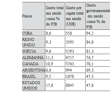 Essa tendência é ainda enfatizada quando se examina o perfil dos gastos em saúde no Brasil e em outros países que adotam sistemas universais de saúde. Como pode ser observado na Tabela 1, a participação do gasto total em saúde em relação ao Produto Interno Bruto (PIB) no Brasil era, em 2011, próxima a dos países com sistemas universais públicos de saúde, tais como Suécia e Reino Unido. No entanto, quando se examina o gasto per capita, verifica-se a discrepância em relação a esses mesmos países, o que indica que, em termos internacionais, o Brasil gasta pouco em saúde.