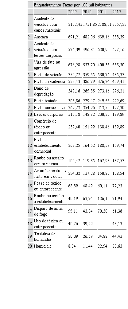 A ameaça classifica-se em segundo lugar nos anos de 2009 a 2012 e, em quarto lugar, nos anos de 2013 e 2014, como pode ser percebida na Tabela 2. Nesse último período, o furto qualificado sobe para o segundo lugar, mas deve ser considerado que no período anterior as ocorrências abrangidas por esta categoria estavam subdivididas nas nomenclaturas furto de veículo, furto à residência e furto a estabelecimento comercial.