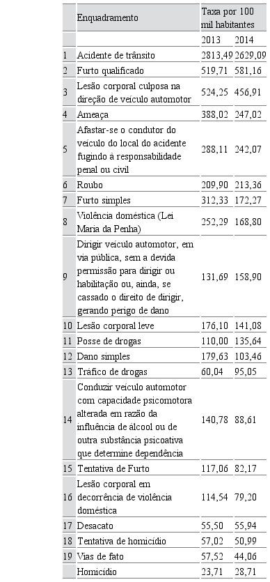 A categoria vias de fato, que se situava entre os anos de 2009 a 2012, com diminuição entre o início e o final do período, cai para o 19º lugar nos anos de 2013 e 2014 com declínio considerável na taxa por 100 mil habitantes, que pode estar associada à extinção/junção de nomenclaturas correlatas.