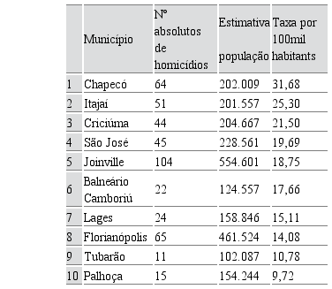 Na relação com o Brasil, mantendo a observação ao princípio da proporcionalidade populacional e análise por série histórica, embora Santa Catarina tenha sido identificada pelo Diagnóstico dos Homicídios no Brasil (BRASIL, 2015), do Sistema Nacional de Informações de Segurança Pública (Sinesp), como o estado federativo com menor índice de homicídios, Chapecó figura entre as cidades do estado com maiores taxas de homicídios por 100 mil habitantes e com um índice próximo aos maiores do país.