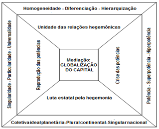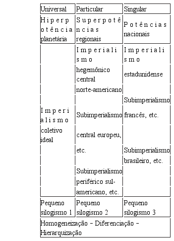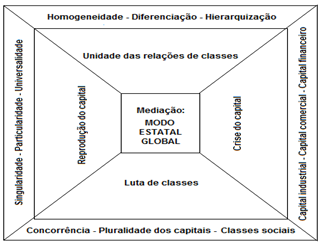 A lógica dialética hegeliana (HEGEL, 1976, 1981, 1993) – tornada marxiana através de novos aspectos materialistas e históricos, críticos e revolucionários (LÉNINE, 1973; BLOCH, 1977) – pode servir para apreender o movimento tendencial para a globalização da forma-Estado capitalista. O que se elabora no domínio estatal vem da simples aplicação do método usado na abordagem do movimento cíclico do capital social total, isto é, um grande silogismo que se decompõe em três pequenos silogismos, a saber: o ciclo do capital-dinheiro (generalidade), o ciclo do capital- mercadoria (particularidade) e o ciclo do capital produtivo (singularidade), que se opõem, em última instância, enquanto totalidade concreta de capitais numerosos, cujas contradições são classistas e inter-classistas (MARX, 1974,1975, 1976a, 1976b; LEFEBVRE, 1980), em que o silogismo histórico amplia a riqueza de suas determinações considerando, também, a totalização envolvendo homogeneidade, diferenciação e hierarquização.