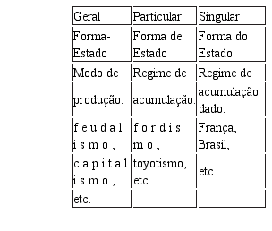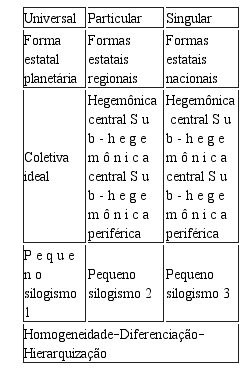 Para a passagem da crítica da economia política à crítica do Estado capitalista, definiu- se a figura do grande silogismo do modo estatal global (Quadro 2), como no quadro abaixo, com as três figuras das formas estatais capitalistas atuais (horizontalmente), que também envolvem homogeneidade, diferenciação e hierarquização (verticalmente).