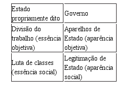 Enquanto expressão de um ser social e histórico, uma categoria inserida no contexto de uma formação socioeconômica (MARX, 1977), a forma-Estado capitalista (FARIAS, 1988, 2000) tem sua estrutura determinada pelo cruzamento formal de duas exigências metodológicas, a saber: a distinção entre essência e aparência, inerente a toda abordagem científica, e a distinção específica, por causa das características do ser examinado, entre o lado objetivo (natural) e o lado subjetivo (social). A combinação dessas exigências nos dois eixos cartesianos permite a construção de uma figura de quatro quadrantes, cujo eixo vertical separa o Estado propriamente dito de sua manifestação como governo, e o eixo horizontal divide essas duas formas entre sua objetividade e sua sociabilidade. A socialização e o surgimento do modo de existência estatal não implica uma clivagem ontológica do seu ser, porque a forma-Estado envolve e relaciona, simultaneamente, as suas quatro determinações estruturais, a saber: