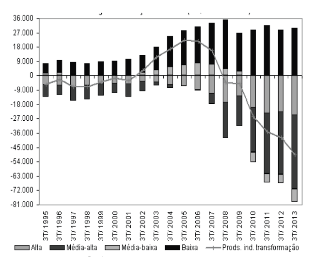 La hausse soutenue du salaire minimum, la baisse du chômage dans la première décennie du XXI° siècle, ont participé fortement à la baisse de la pauvreté, ce qui d’un point de vue politique est à mettre à l’actif des gouvernements Lula 1 et 2 et Dilma 1, mais en l’absence d’une politique structurelle visant à stopper la désindustrialisation, se sont traduites par une forte augmentation des importations. Le wage led, au lieu de stimuler le marché interne, a ainsi conduit à un déficit de plus en plus important de la balance commerciale des produits de l’industrie de transformation dès 2008 et à des difficultés croissantes d’exporter des produits industriels plus ou moins sophistiqués (Figure 1) ainsi que le souligne l’ensemble des publications de l’Instituto de Estudos para o Desenvolvimento Industrial (IEDI).