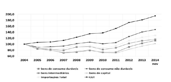 prix des biens importés et coût unitaire du travail en réal, 2004=100