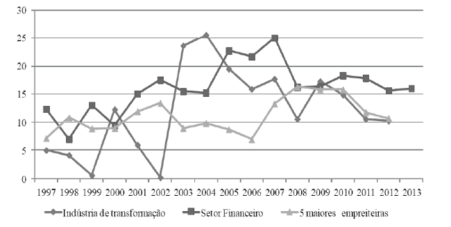 Au vu de ces données, on peut donc déduire que la croissance est tout compte fait relativement modeste en Amérique latine et au Brésil, pays le plus puissant et le plus peuplé de la région. Et qu’aujourd’hui nombre de pays asiatiques ont un revenu par tête plus élevé que dans les pays émergents latino-américains. Pourtant, dès l’arrivée du Président Lula da Silva au pouvoir, la croissance s’accélère, la pauvreté baisse drastiquement mais contrairement à ce qui se dit officiellement, les riches deviennent plus riches et la part des 1% dans le revenu des plus riches s’accroit comme dans l’ensemble des pays avancés, le Brésil ne faisant pas exception sauf dans sa capacité à diminuer la pauvreté1 (SALAMA, 2014, 2012 apud SALAMA, 2015). Nombre d’économistes s’interrogent alors sur la possibilité que le Brésil devienne un nouvel eldorado. Le mythe s’effondre dès 2011 et les rêves s’envolent, le miracle devient mirage, voire cauchemar dès 2014.