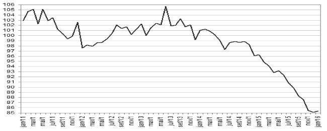 La crise a été systématiquement sous- estimée par les instituts de prévision, au point que toutes les deux semaines, les prévisions, révisées, devenaient de plus en plus pessimistes. La chute du PIB est la plus élevée depuis plus de trente ans. Nous l’avons vu. Celle du Pib par tête est encore plus nette (voir Tableau 3). Les perspectives de reprise s’éloignent. Il n’est pas certain qu’en 2017 une récupération économique ait lieu… L’appareil industriel se rétrécie a vue d’œil. Le taux d’investissement chute en effet très fortement (Tableau 4). La baisse cumulée sur douze mois de janvier 2015 à janvier 2016 est pour le secteur des biens d capital de -27%, pour les biens intermédiaires de -6% et pour les biens de consommation de - 9,9%, celle affectant les biens de consommation durables étant de -19 ,9% selon l’IBGE. La désindustrialisation se poursuit à un rythme accéléré malgré une très légère reprise au début de 2016 (Figure 4).