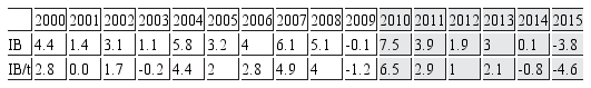 Selon I'Instituto Brasileiro de Geografia e Estatística (IBGE), le taux de croissance du PIB brésilien baisse dès 2011: 3,9% en 2011, 1,9% en 2012, 3% en 2013, 0,1% en 2014. La croissance fléchit avant même que ne s’effondrent les prix des matières premières. En 2015, les prévisions sont continuellement revues à la baisse et l’année se termine avec une chute du PIB de -3,8% et le PIB par tête s’effondre: -4.6%. La consommation des ménages baisse de 3,9%, le taux d’investissement tombe en chute libre: -14,6% annonçant ainsi la poursuite de la crise pour 2016, voire 2017, la production baisse fortement: -6,8%, et seuls le secteur agricole croit légèrement: 1,8% et les exportations croissent entre février 2015 et février 2016 de 4,6%. Malgré la chute du cours des matières premières, la contrainte externe s’atténue2. Ce qui n’est pas le cas, loin de là de la contrainte interne (solde budgétaire) comme nous le verrons plus loin.