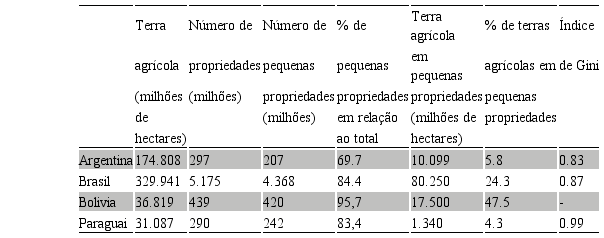 Pode-se observar na Tabela 2 que no Brasil e Paraguai mais de 80% das propriedades são pequenas e ocupam 24.3% e 4.3% de todas as terras agrícolas respectivamente. A Bolívia se destaca por apresentar mais de 90% de suas terras sob a posse de pequenos agricultores/indígenas, entretanto respondem apenas por 47.5% das terras agrícolas. Na Argentina, observa-se índice menor que nos outros países, com 69.7% de propriedades nas mãos de pequenos agricultores, ocupando apenas 5.8% das terras agrícolas.