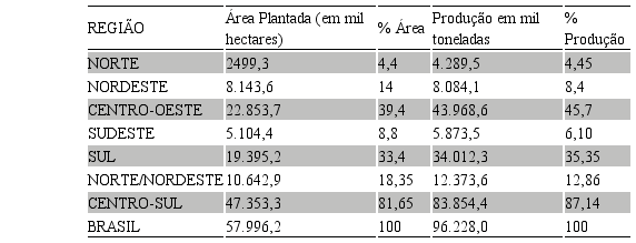 Atualmente, dezessete estados brasileiros aparecem nas estatísticas oficiais como produtores de soja. Do total da produção, 45,7% concentra- se na região Centro-Oeste; na região Sul 35% da produção, na região Nordeste e Sudeste, respectivamente, 8,4%, 6,1% da produção brasileira e na região Norte 4,45%. Observa-se na Tabela 4, que as regiões Centro-Sul agregam juntas 87,14%, enquanto Norte/Nordeste figuram com percentual bem menor de 12,86%. As áreas de cerrado e Amazônica são apontadas como espaços de expansão futura da monocultura da soja.