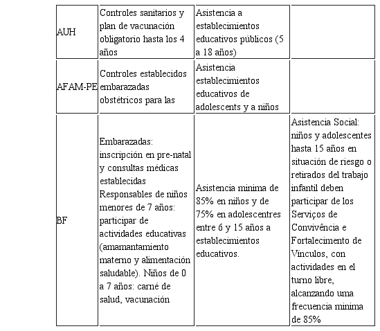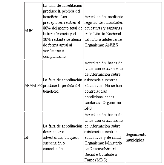Del estudio comparado de la Asignación Universal por Hijo (AUH) en Argentina, las Asignaciones Familiares del Plan de Equidad (AFAM-PE) en Uruguay y del Bolsa Familia (BF) en Brasil se desprende que en los tres casos se exigen condicionalidades educativas y sanitarias y que las principales diferencias se registran en los mecanismos de control, verificación y tipo de sanción en caso de incumplimiento. El Cuadro 1 resume las condicionalidades exigidas por cada programa.