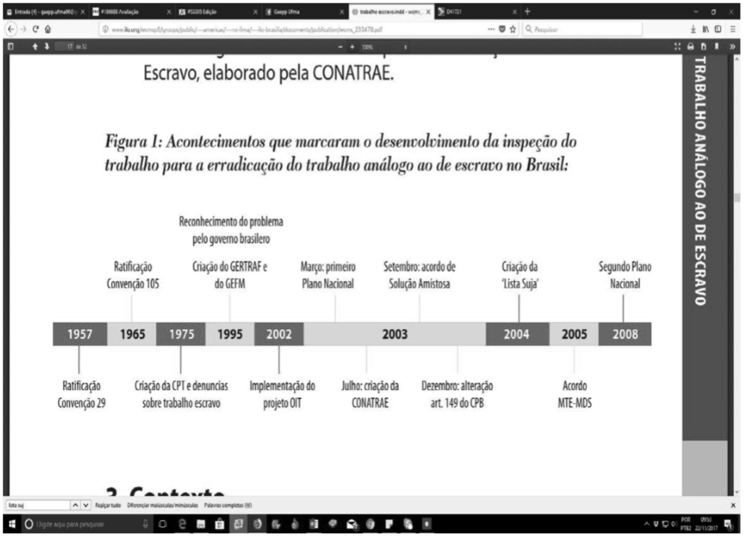 Já no ano de 2003 houve a criação da Comissão Nacional de Erradicação do Trabalho Escravo (CONATRAE), do acordo de Solução Amistosa entre o Estado Brasileiro, representado pela Secretaria Especial de Direitos Humanos da Presidência da República, e as peticionárias, representadas pelo Centro pela Justiça e o Direito Internacional, CEJIL-Brasil e a Comissão Pastoral da Terra, havendo uma evolução histórica de interesse ao combate à mão de obra escrava, como demonstra a Figura 1 a seguir.